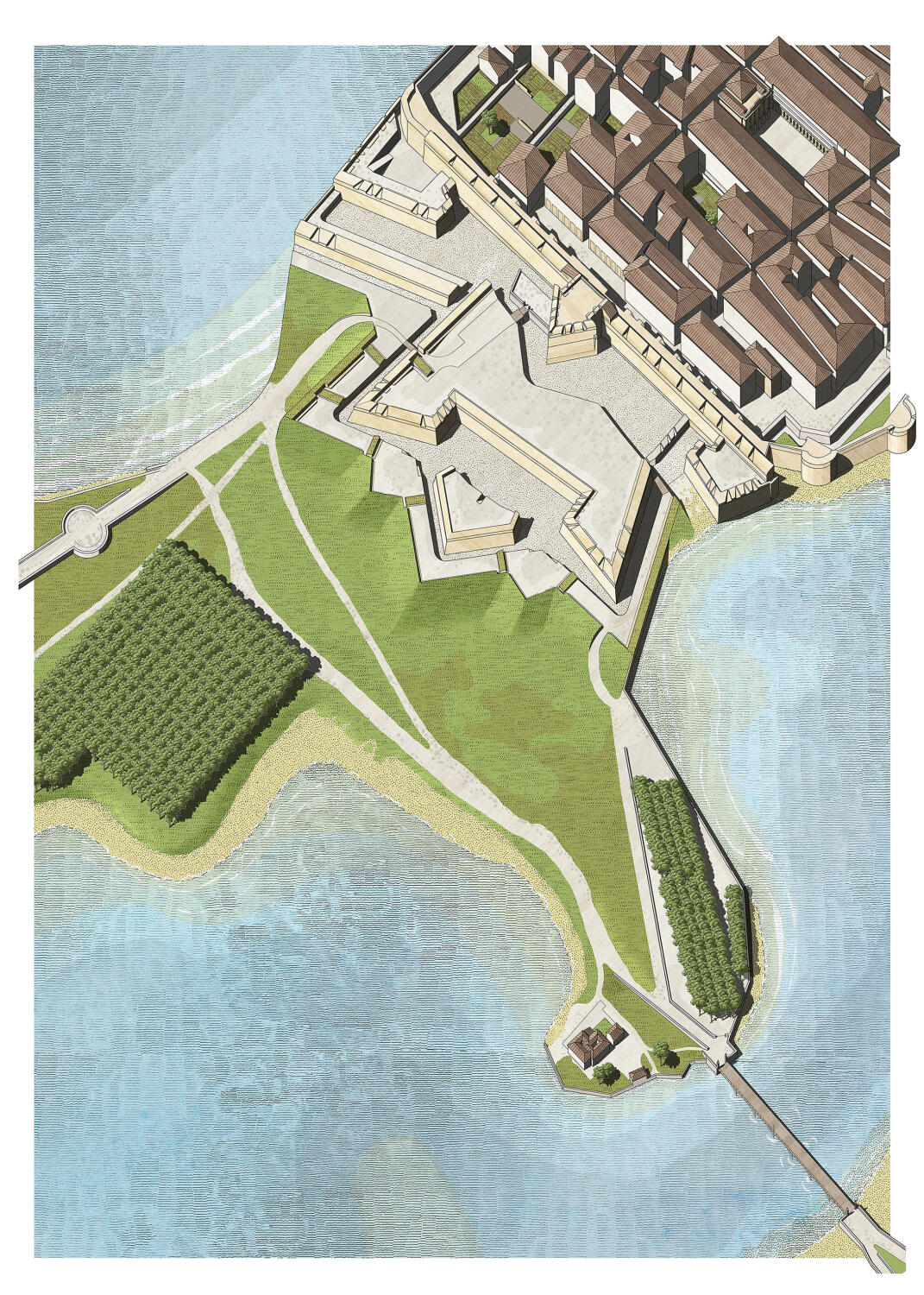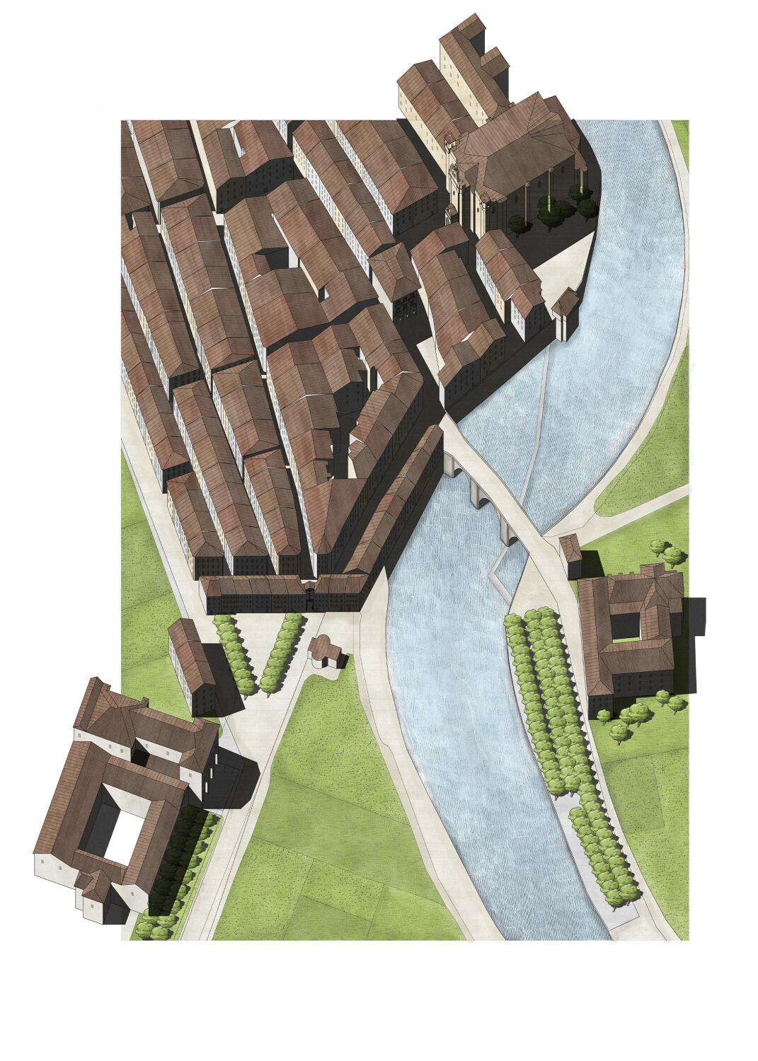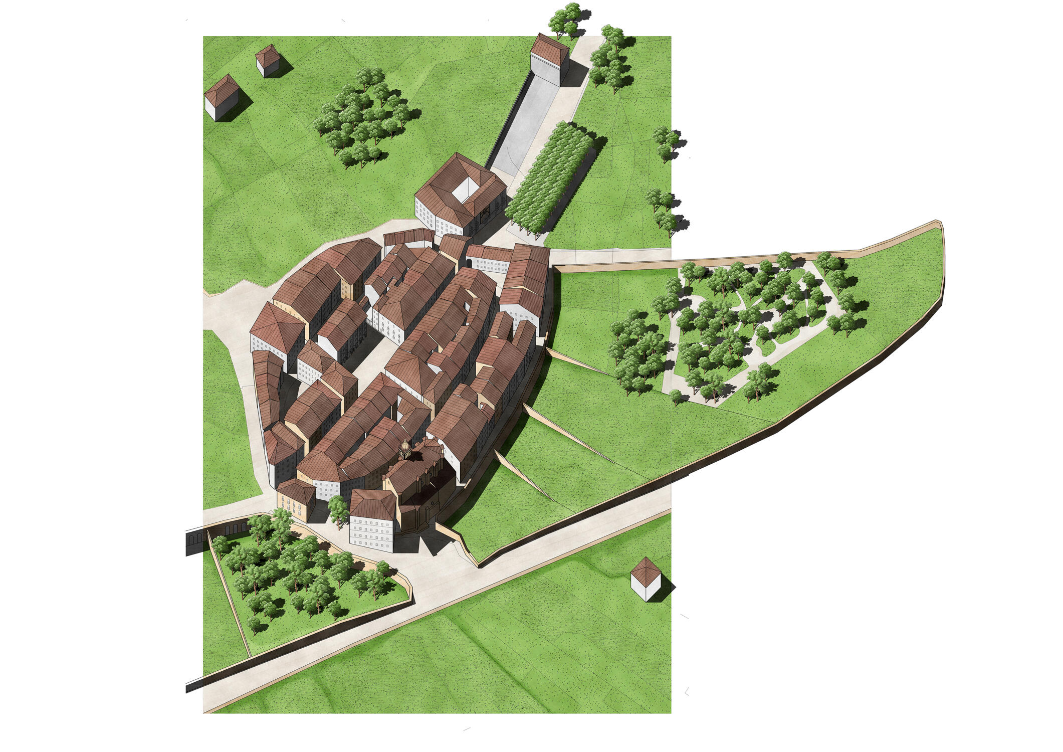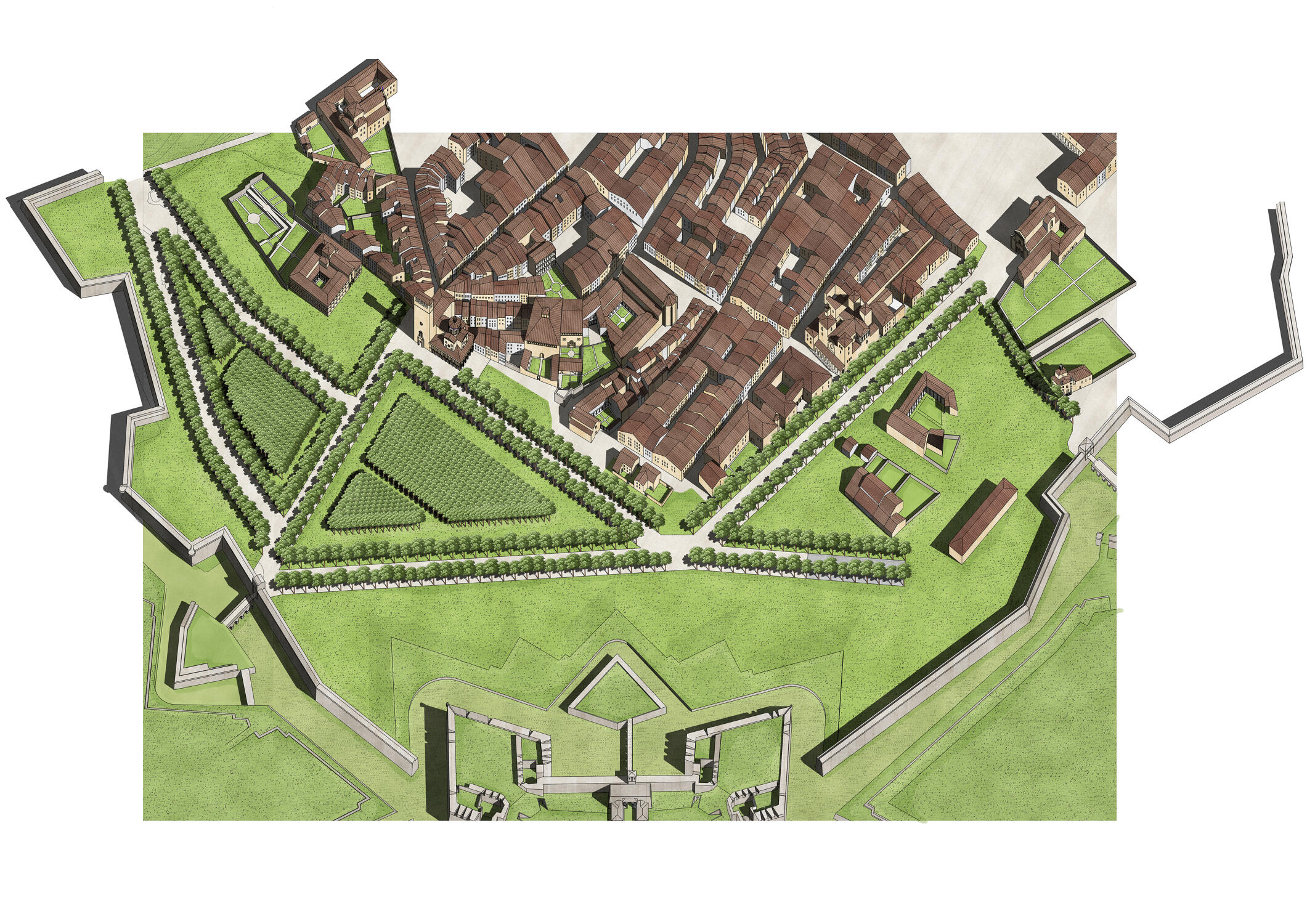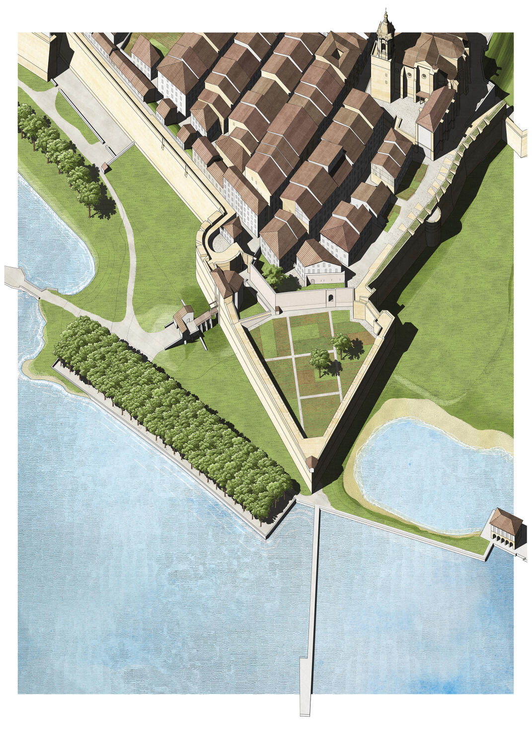 Durante la investigación estudiamos el contexto de estos espacios arbolados dentro de la tradición de la ciudad europea desde la Antigüedad hasta el Movimiento Moderno. El corazón del trabajo fue estudiar los ejemplos construidos durante la Ilustración en el País Vasco: desde los paseos y alamedas de las cinco capitales, pasando por las villas hasta llegar a las poblaciones rurales. La investigación culmina con el análisis de dos proyectos urbanos que destacan por la singularidad de su origen, lo novedoso de la propuesta y el alcance de su planteamiento: el proyecto de Ochandategui para Nueva Sangüesa y el de Silvestre Pérez para el Puerto de la Paz en Abando, Bilbao.
